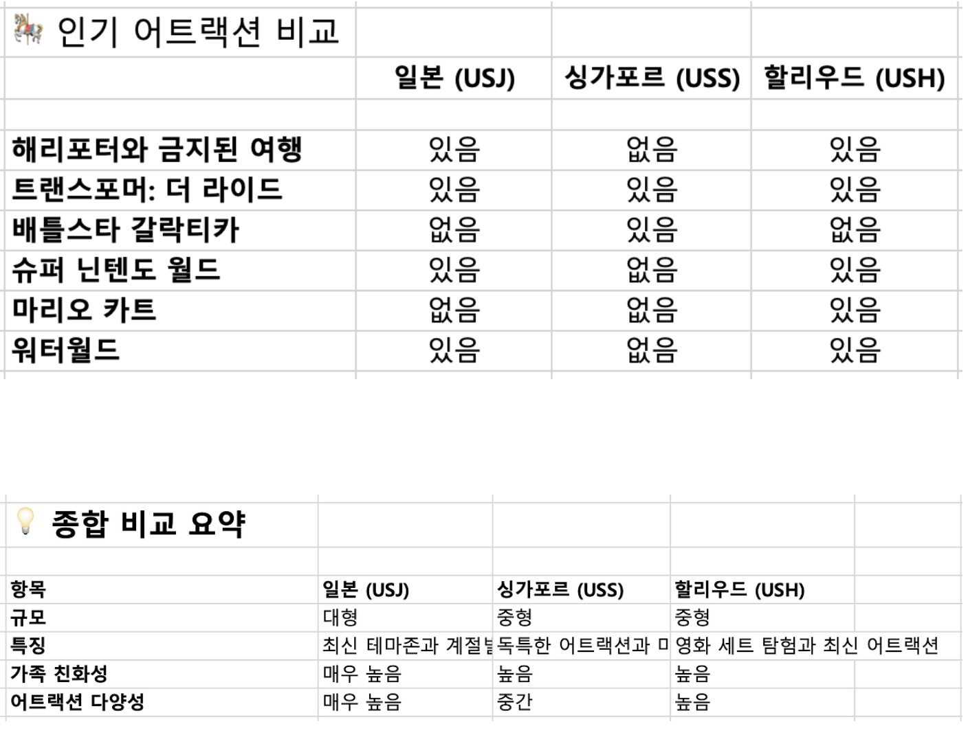 이렇게 유니버셜 스튜디오 헐리우드, 싱가포르, 일본을 비교해 보는 시간을 가졌는데요, 규모와 인기 어트랙션, 특징들을 비교하여 방문에 참고해 보시길 바랍니다. 아래에는 인기 어트랙션 비교표와 종합 비교 요약 표를 공유해 보겠습니다. 세 개의 지점 모두 영화를 테마로 하기 때문에 비슷한 점이 많이 있겠지만, 지역적 특성과 각 지점 별 특별한 테마를 각기 비교해 보며 세 지점 모두 방문해 보는 것도 재미있을 것입니다.