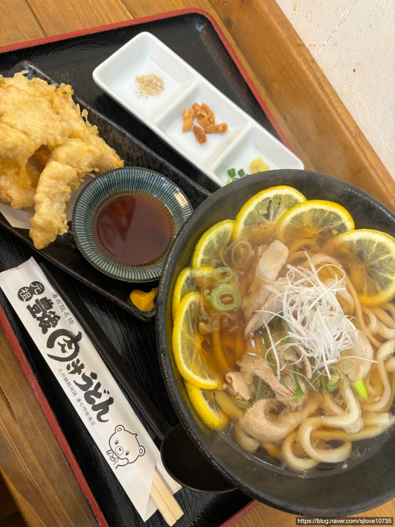 비도 오고 그래서 우동이 끌렸는데 유후인 로컬 대표 식재료 닭 + 레몬 같은 신 열매를 모두 즐길 수 있는 현지 시그니처 우동을 주문했습니다. 맛은 새콤하고 담백하니 별미였습니다. 유후인에서 가장 유명하다는 닭튀김도 곁들여보았고 아주 만족하였습니다. 유후인에서 유명한 캐릭터들도 구경하며 기념품샵도 둘러보고 한참을 걸었습니다. 사실 가이드님에게 우산을 빌렸는데 생각보다 비가 너무 많이 오기도 했고 하루 종일 내릴 것 같아 우산을 사려고 걸어 다니며 우산 서칭을 하였습니다. 그리하여 스누피 접이식우산을 1100엔에 구매 완료.